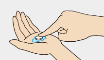 目からはずしたレンズを手のひらの上にのせ、用剤数滴たらし、レンズの両面を各20回程度、指の腹で軽くこすり洗いします。